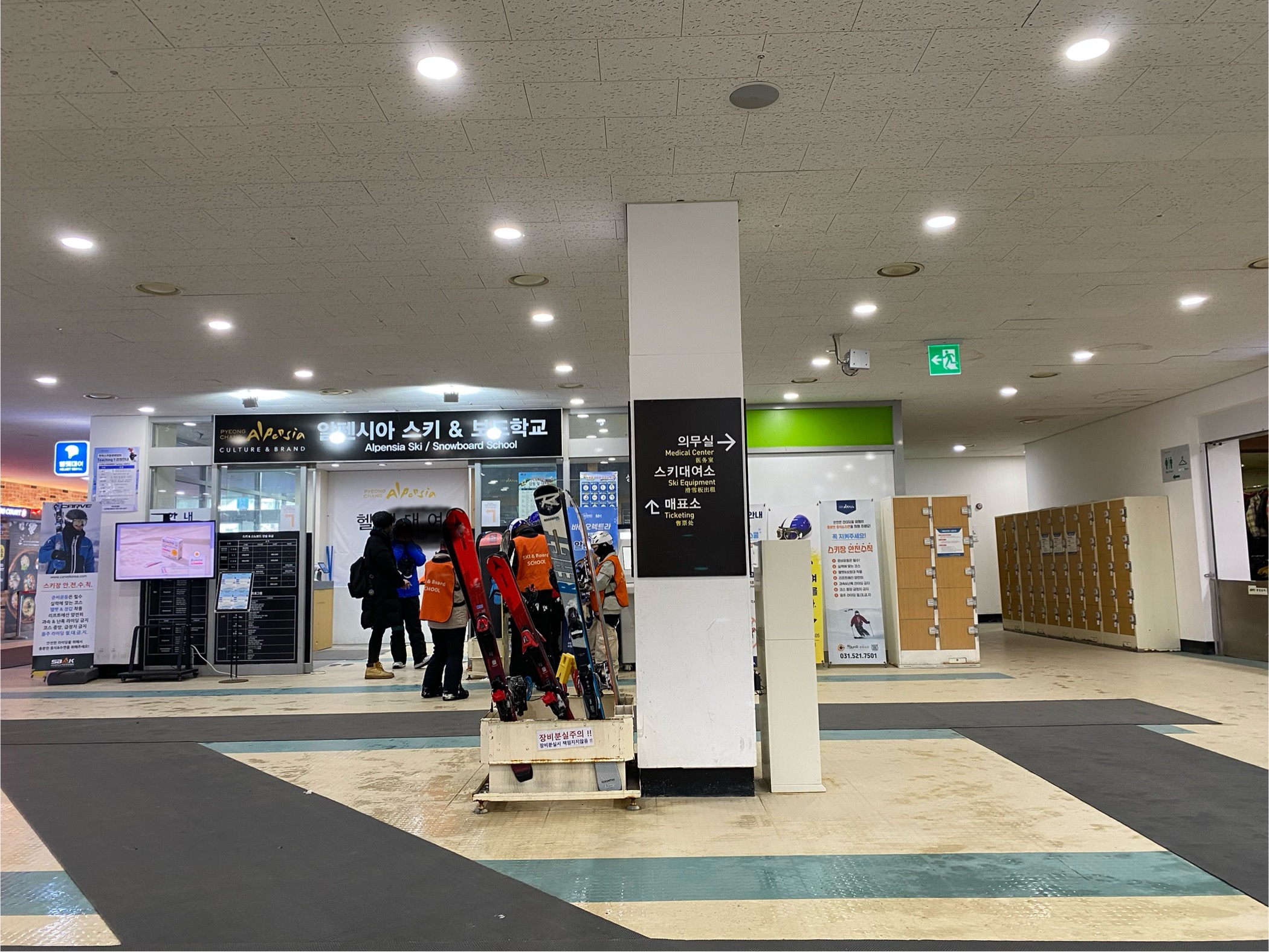 알펜시아가 좋은 점은 스키하우스 한 곳에 필요한 것이 다 모여있어 편리하게 이용할 수 있다는 거예요. 심지어 하이 시즌에도 사물함이 모자라지 않을 정도로 곳곳에 물품보관함이 넉넉하게 구비되어 있어요.