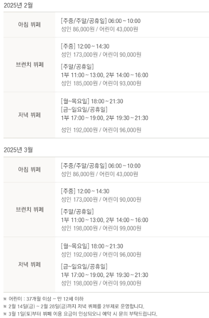 기존에는 주말 브런치 가격이 성인은 185,000원, 어린이는 93,000원이었으나 2025년 3월부터는 성인이 198,000원으로 13,000원 인상되고 어린이는 99,000원으로 6,000원 인상됩니다.